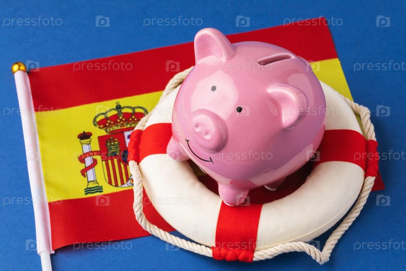 Копилка, спасательный круг и флаг на синем фоне, концепция на тему спасения испанской экономики