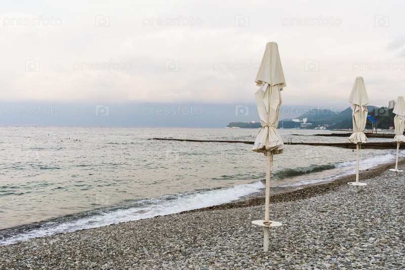 Пасмурная погода и пустой галечный пляж с закрытыми шезлонгами
