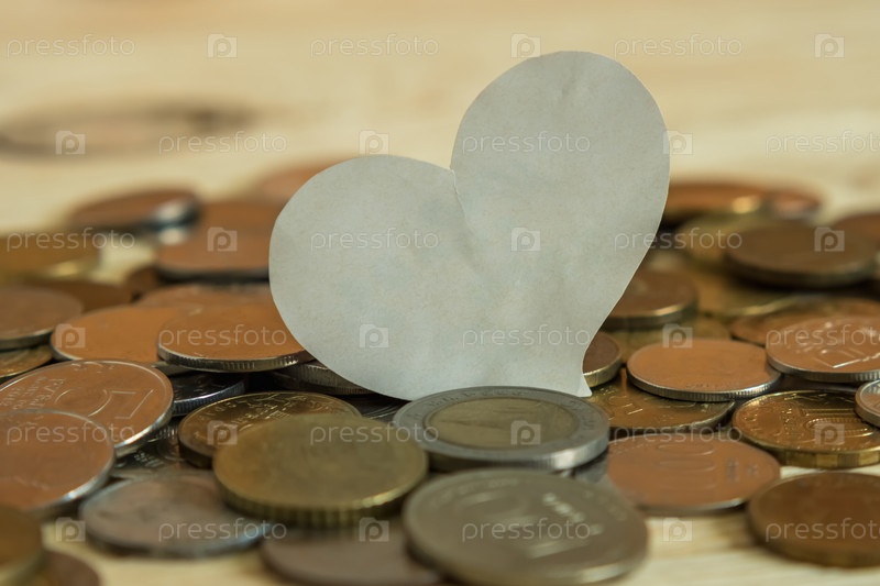 На деревянном столе разбросаны монеты из разных стран. На их фоне белое сердце