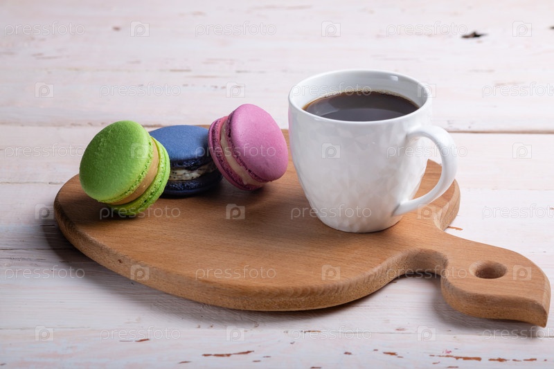 Различные виды миндального печенья и белая чашка кофе на деревянной доске с планом курупа. Французский завтрак