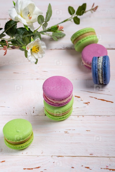 Разнообразие нежного миндального французского миндального печенья на светлом деревянном столе крупным планом