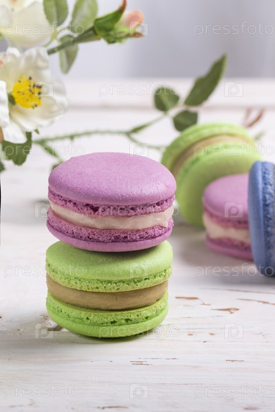 Разнообразие нежного миндального французского миндального печенья на светлом деревянном столе крупным планом