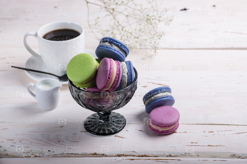 Различные виды миндального печенья в стеклянной вазе на светлом деревянном фоне