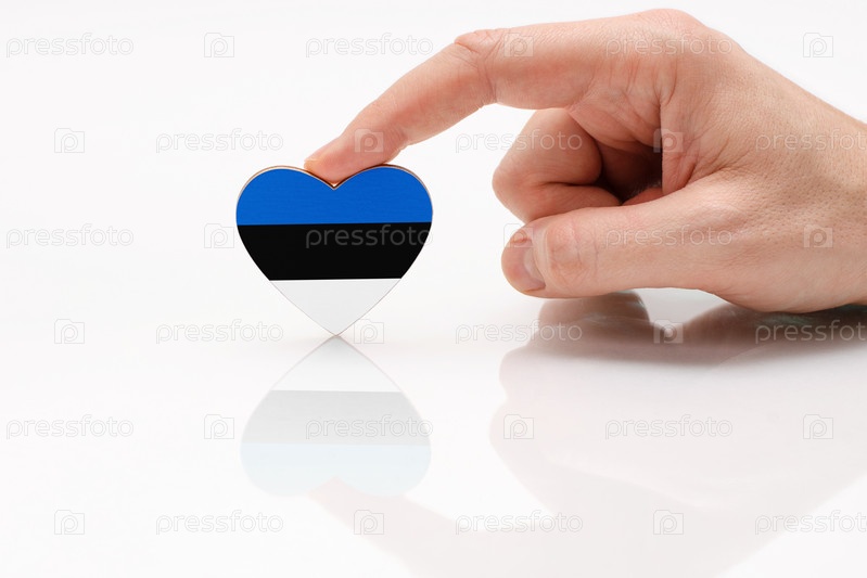 Любите и уважайте Эстонию. Мужская рука держит сердце в форме эстонского флага на поверхности белого стекла. Концепция эстонского патриотизма и гордости