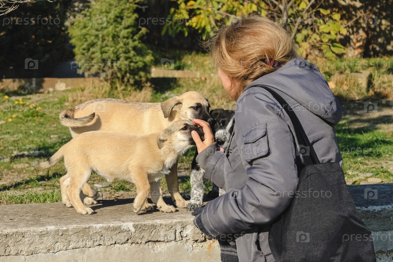 Девушка гладит случайно встреченных на улице щенков. Одна собака лижет ей руку