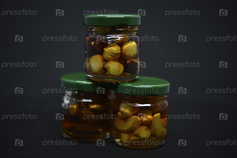 Стеклянные банки с орехами в меду. Вкусные сладости. Орехи в меде. Сладкие орехи