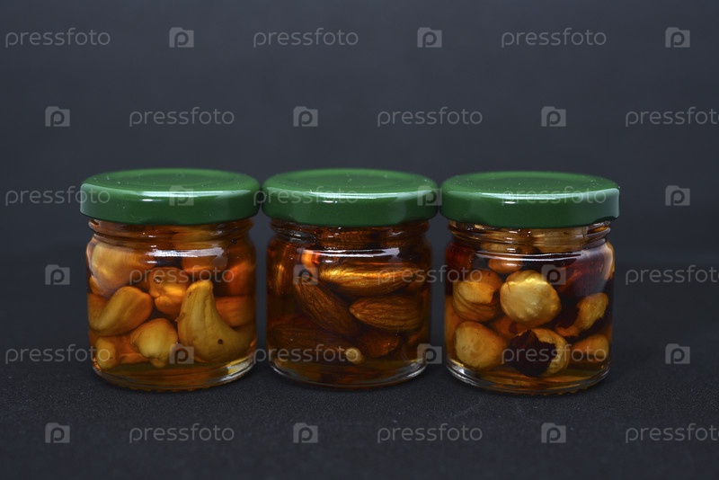 Стеклянные банки с орехами в меду. Вкусные сладости. Орехи в меде. Сладкие орехи