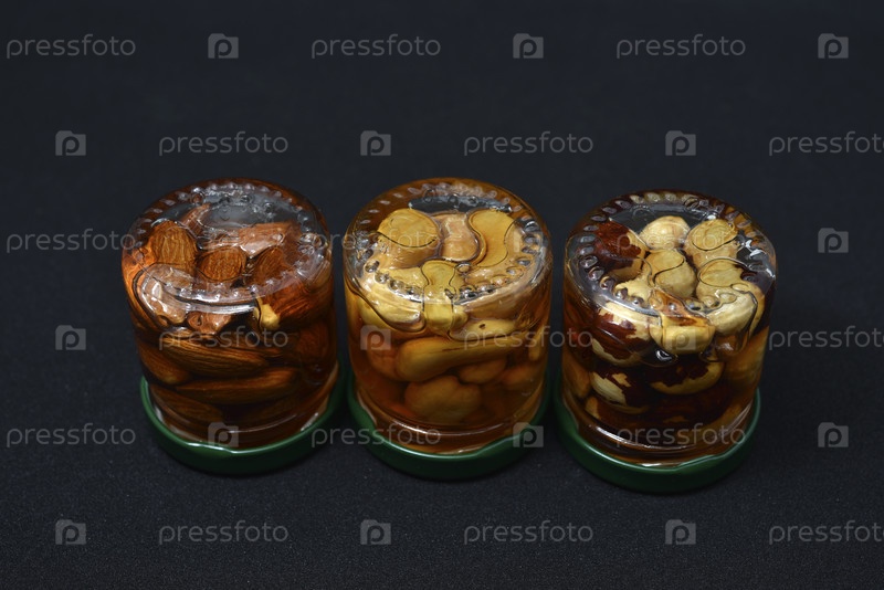 Стеклянные банки с орехами в меду. Вкусные сладости. Орехи в меде. Сладкие орехи