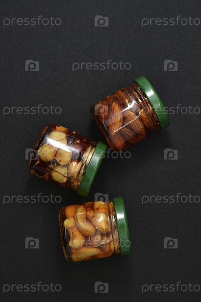 Стеклянные банки с орехами в меду. Вкусные сладости. Орехи в меде. Сладкие орехи