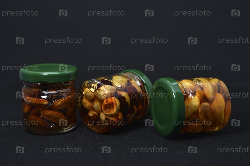 Стеклянные банки с орехами в меду. Вкусные сладости. Орехи в меде. Сладкие орехи