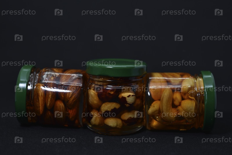 Стеклянные банки с орехами в меду. Вкусные сладости. Орехи в меде. Сладкие орехи