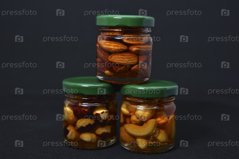 Стеклянные банки с орехами в меду. Вкусные сладости. Орехи в меде. Сладкие орехи