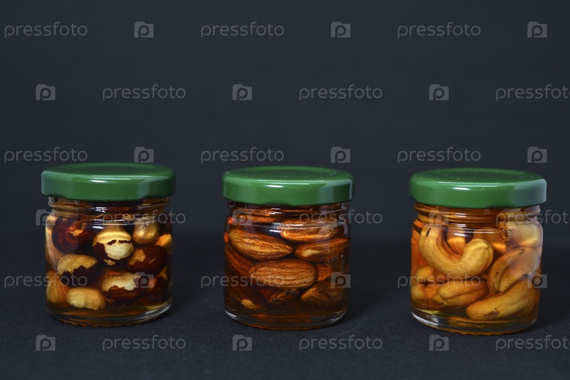 Стеклянные банки с орехами в меду. Вкусные сладости. Орехи в меде. Сладкие орехи