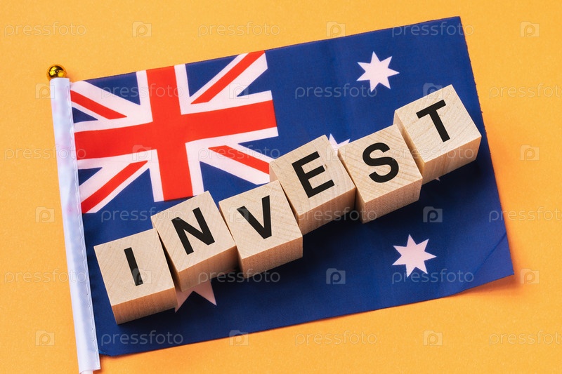 Деревянные кубики с текстом и флагом на цветном фоне, инвестиционная концепция в Австралии