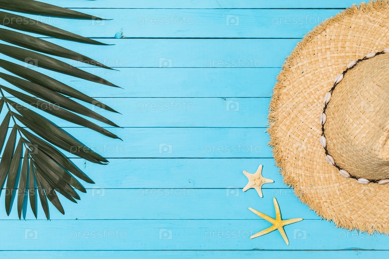 Пальмовый лист, соломенная шляпа и морская звезда на синем деревянном фоне, вид сверху