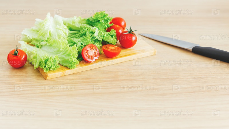 Кухонный натюрморт со спелыми овощами, разделочным столом и ножом на деревянном фоне