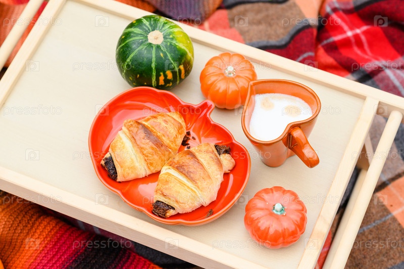 Осенний завтрак на пикнике. Два круассана и кофейная кружка в форме сердца рядом с тыквами. Выборочная фокусировка