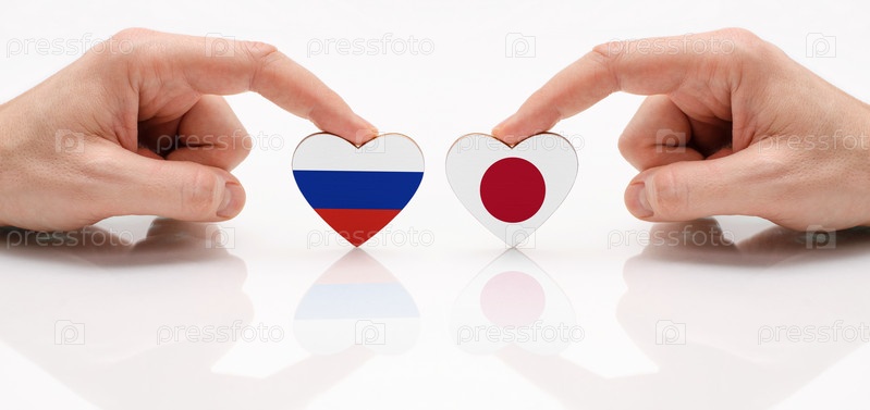Концепция дружбы и дипломатических отношений между Россией и Японией. Две мужские руки держат флаги в форме сердца на стеклянном столе. Флаг России и Японии