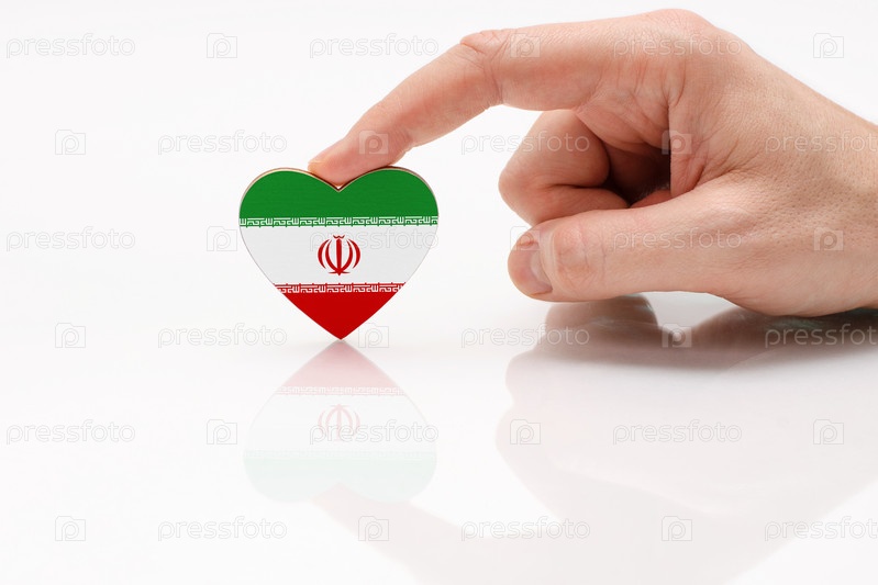 Иранский флаг. Любите и уважайте Иран. Мужская рука держит сердце в форме иранского флага на поверхности белого стекла. Понятие патриотизма и гордости