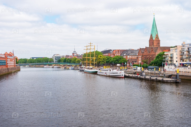 Бремен, Германия. Панорамный вид на город с пешеходным мостом через реку Везер и башней церкви Святого Мартина. Лодки и корабли на пристани вдоль набережной