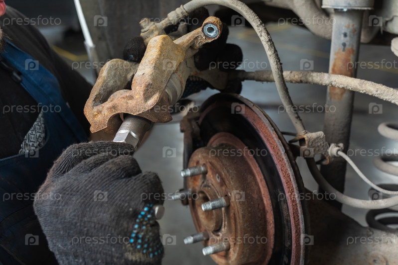 Автомеханик ремонтирует тормозной суппорт, затягивает винт