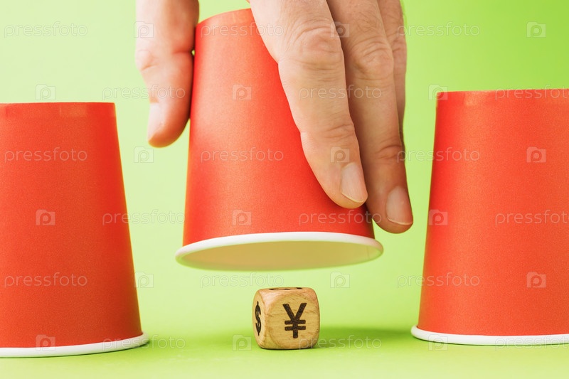 Поднятый бумажный стаканчик и деревянный куб с символом юаня под ним, концепция азартных игр наперсток