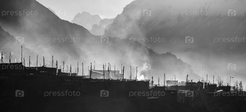 Молитвенные флаги в деревне Мананг. Туманное утро, Непал, Гималаи, заповедник Аннапурны