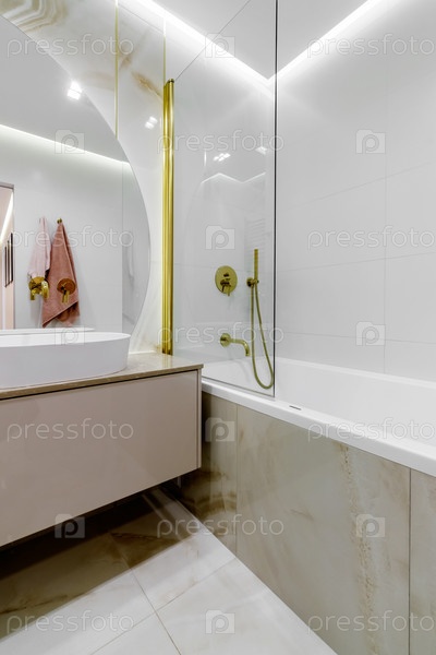 Ванная комната из белого мрамора с круглым зеркалом, золотыми смесителями и душем