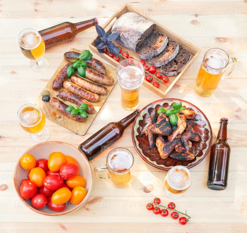 Жареные куриные крылышки, жареные сосиски, стаканы, кружки и бутылки пива, хлеб и миска с помидорами на деревянном столе. Вид сверху