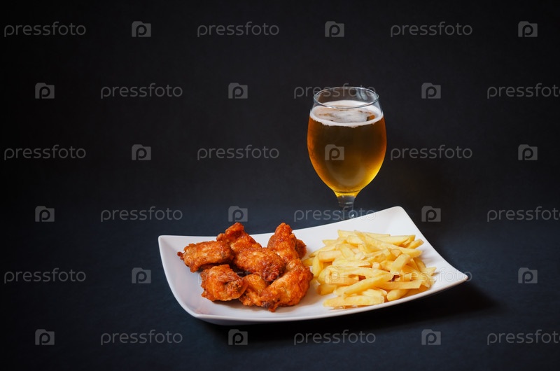 Куриные крылышки с картофелем фри и стаканом пива на темном фоне