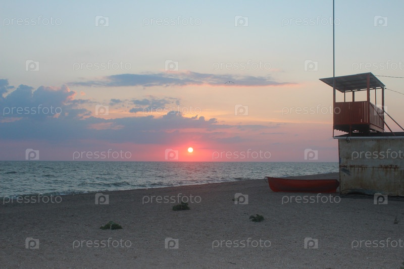 Спасательная вышка на пляже, закат, море