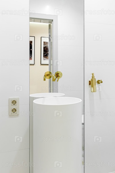 Белая круглая раковина в туалете из белого мрамора с золотым краном