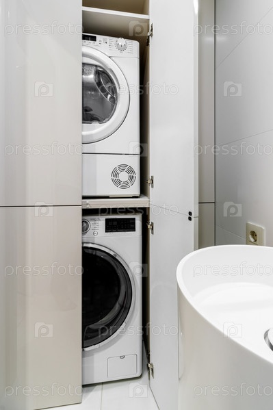 Стиральная машина и сушилка стоят друг над другом в шкафу