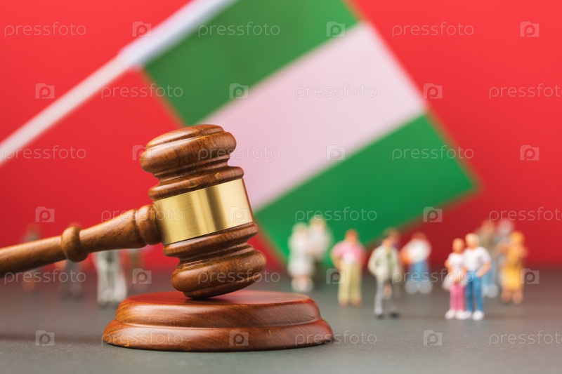 Молоток судьи, флаг Нигерии и пластиковые игрушечные человечки на цветном фоне, концепция судебного разбирательства в нигерийском обществе