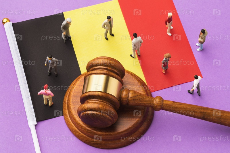 Молоток судьи, флаг Бельгии и пластиковые игрушечные человечки на цветном фоне, концепция судебного разбирательства в бельгийском обществе