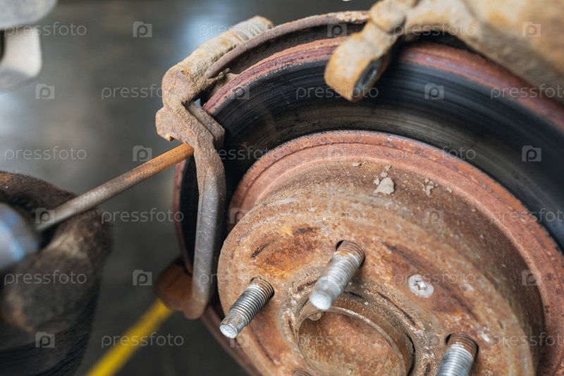 Автомеханик стачивает ржавчину на тормозных дисках перед заменой колодок, крупный план