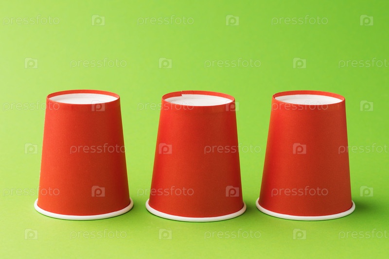 Перевернутые красные бумажные стаканчики на зеленом фоне