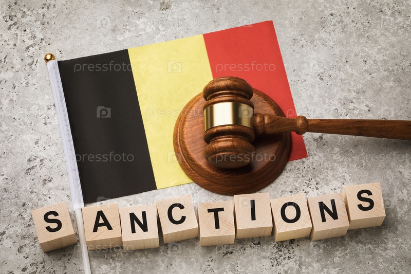 Флаг Бельгии, молоток судьи и деревянные кубики с текстом, концепция на тему санкций со стороны Бельгии