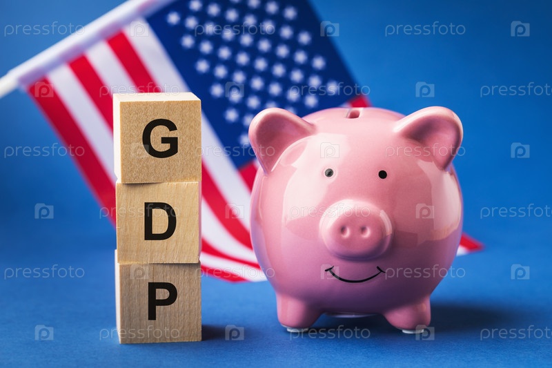 Копилка, деревянные кубики с текстом и флаг на синем фоне, концепция на тему ВВП Соединенных Штатов Америки