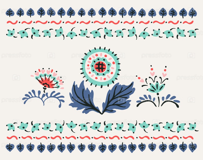 Набор этнических элементов. Бордюр представляет собой полосу с цветами, листьями, ветками, вензелями. Народная вышивка. Славянский, украинский, русский мотив. Хохлома, матрешка, дымковская игрушка. Мексиканский, индийский, цыганский ковер. Вязаное кружево