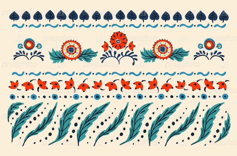 Набор этнических элементов. Бордюр представляет собой полосу с цветами, листьями, ветками, вензелями. Народная вышивка. Славянский, украинский, русский мотив. Хохлома, матрешка, дымковская игрушка. Мексиканский, индийский, цыганский ковер. Вязаное кружево