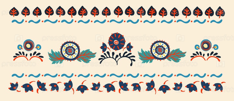 Набор этнических элементов. Бордюр представляет собой полосу с цветами, листьями, ветками, вензелями. Народная вышивка. Славянский, украинский, русский мотив. Хохлома, матрешка, дымковская игрушка. Мексиканский, индийский, цыганский ковер. Вязаное кружево