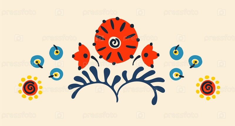 Набор этнических элементов. Бордюр представляет собой полосу с цветами, листьями, ветками, вензелями. Народная вышивка. Славянский, украинский, русский мотив. Хохлома, матрешка, дымковская игрушка. Мексиканский, индийский, цыганский ковер. Вязаное кружево