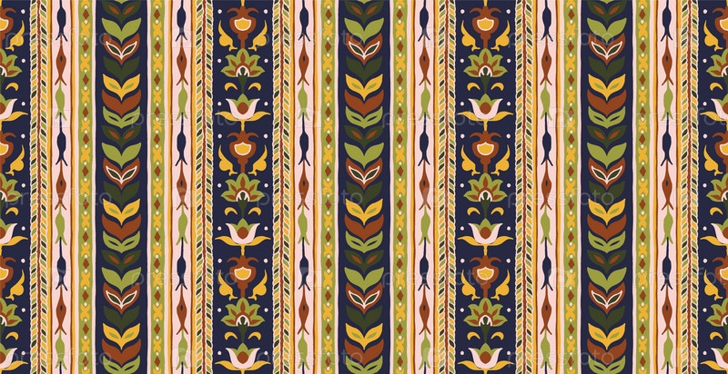 Геометрический дамасский орнамент. Икат границы. Этническая вышивка с листьями и монограммами. Племенная векторная текстура. Бесшовный народный узор в ацтекском стиле. Индийский, скандинавский, цыганский, мексиканский, африканский ковер