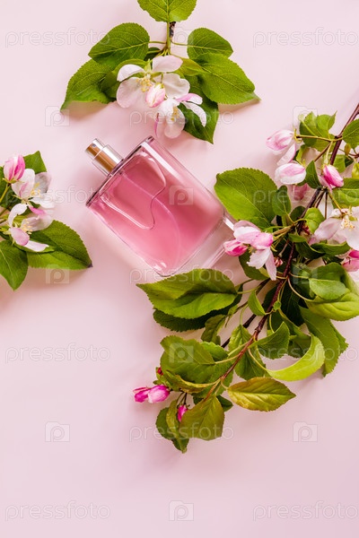 Бутылка женских духов или спрея лежит на розовом фоне среди ветвей цветущей яблони. легкий аромат косметического средства