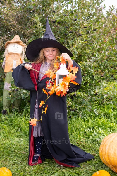 Хэллоуин. Девочка в мантии и шляпе. Маленькая волшебница в костюме