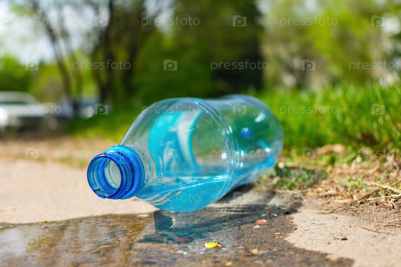 Загрязнение окружающей среды пластиковыми бутылками. Пластиковая бутылка лежит на тротуаре в парке