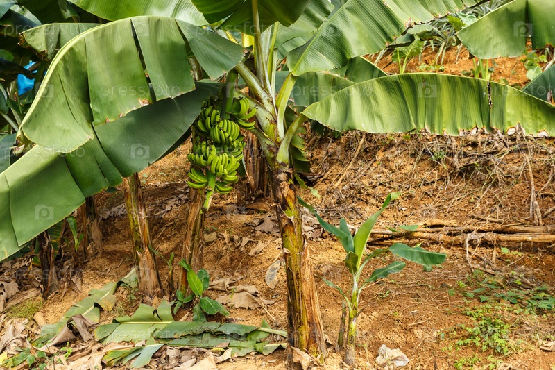 Банановое дерево с кучей бананов. Незрелые бананы висят на ветке