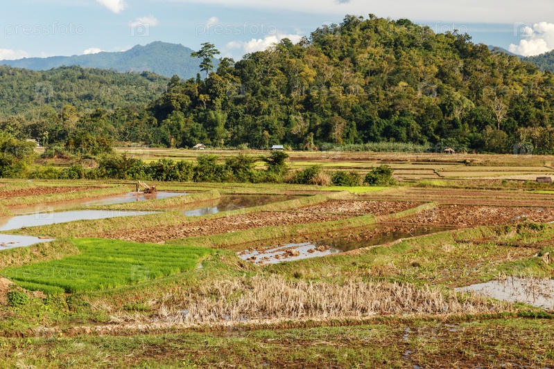 Рисовые поля, подготовка полей к посадке риса, Лаос