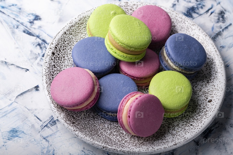 Тарелка с разноцветными миндальными печеньями крупным планом сверху. плоская планировка